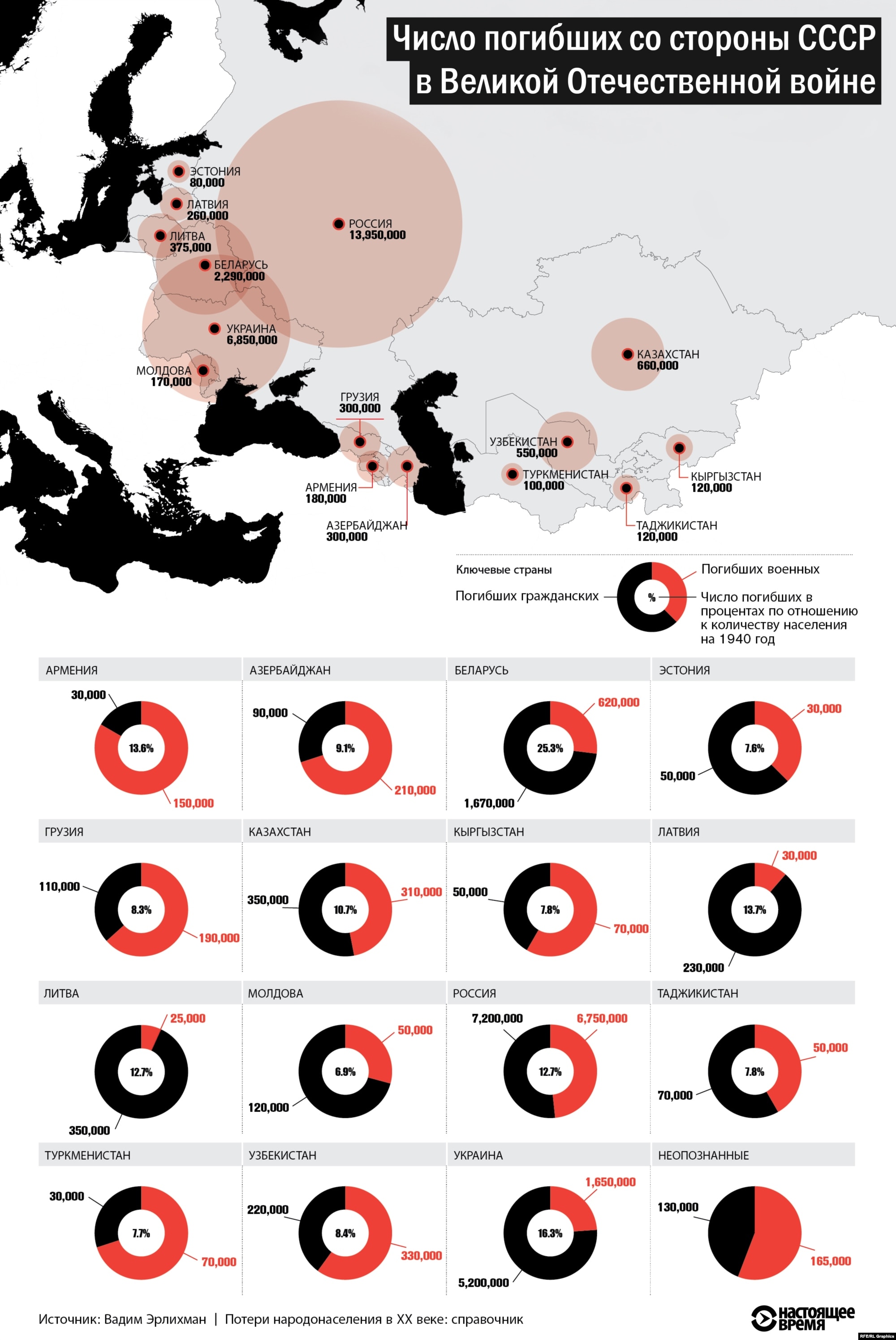 Количество погибших в Великой Отечественной войне по отношению к общей численности населения советских республик.